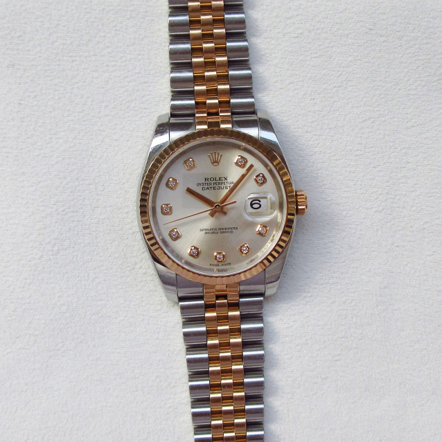 - 表带材质:原装18K玫瑰间金纪念型5珠实心表带(22节)